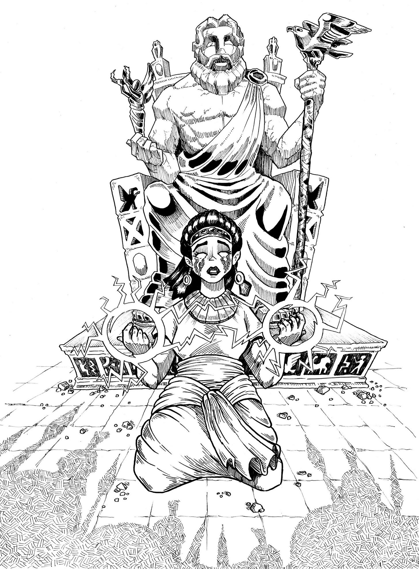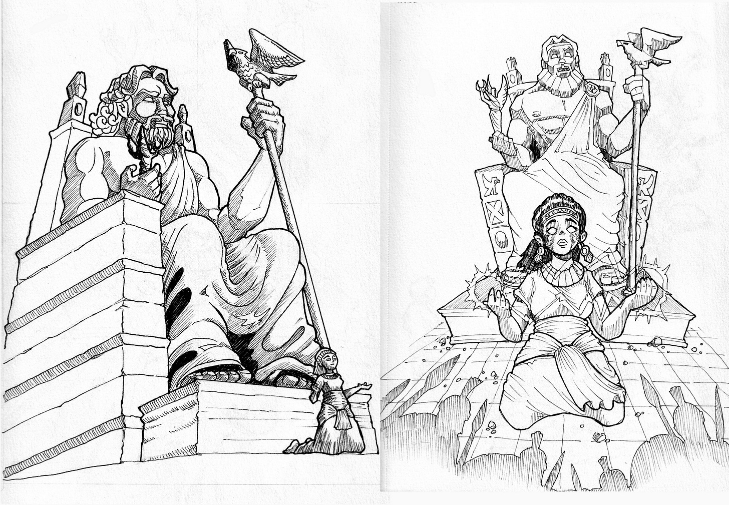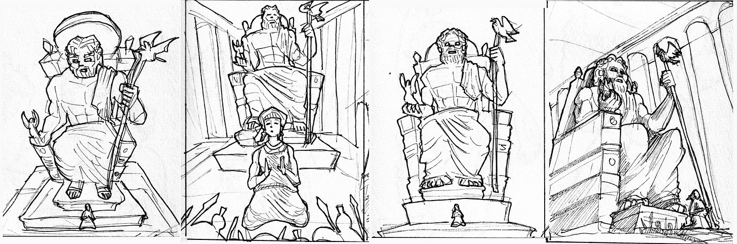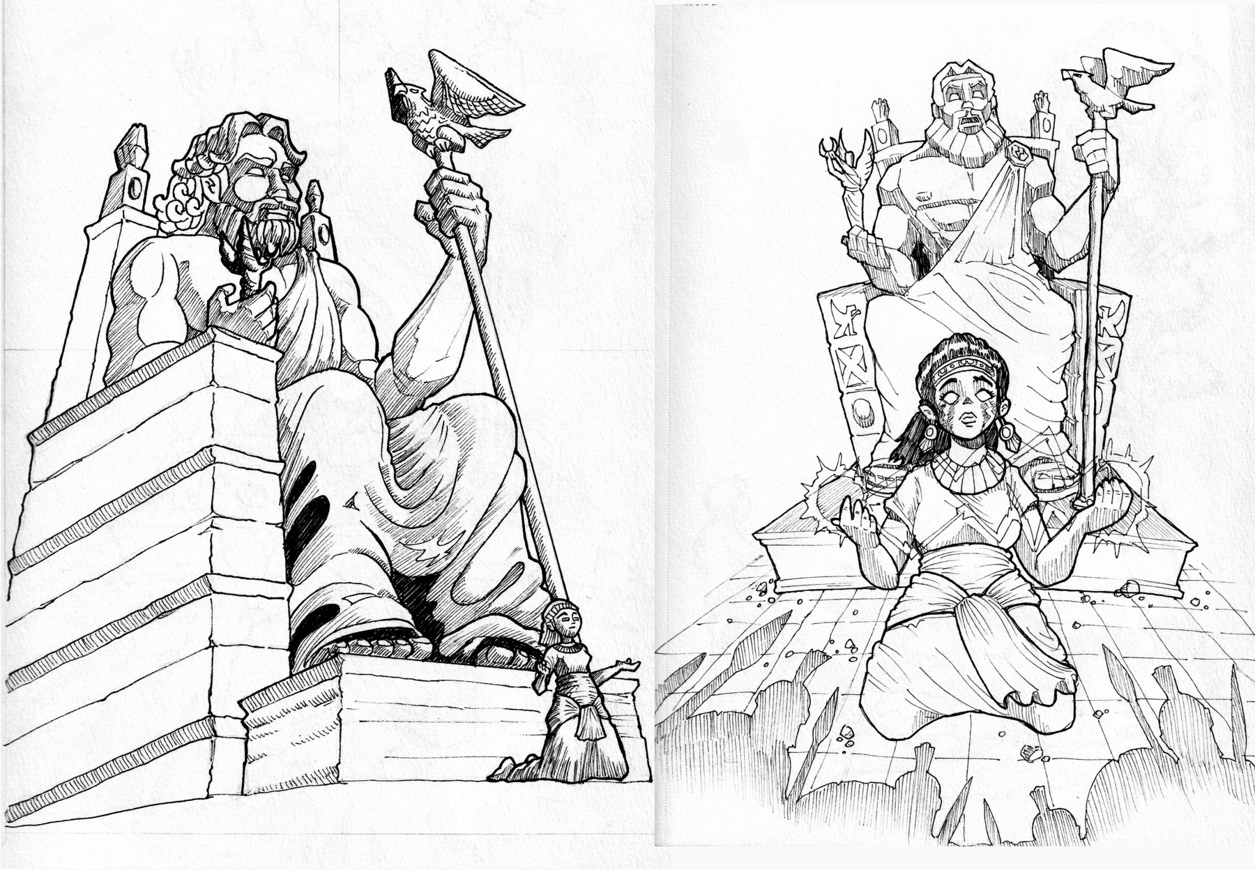 Secondly, once I’ve selected my favorite thumbnail, I scale it up and trace it into a working sketch. In this stage, I correct any proportional errors and add initial details, although my line art or crosshatching isn't fully polished yet. I also start to weave in concepts and themes. This stage may not involve just one working sketch; there could be several, though typically, in my experience, I iterate less on the working sketch.